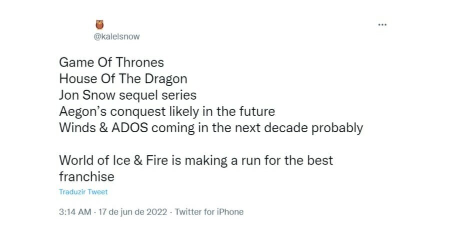 “O Mundo de Gelo & Fogo está concorrendo à melhor franquia”, tuitou um outro fã.