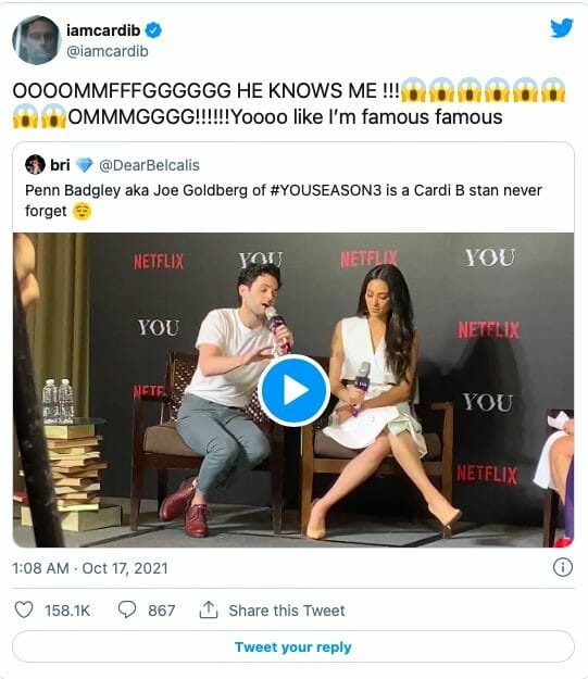 Uma internauta mostrou que Penn Badgley, o Joe de Você (You), é um fã de Cardi B. A cantora notou isso e celebrou, levando a uma interação única com o astro da Netflix.