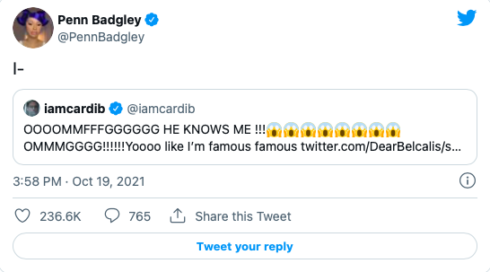 No Twitter, o ator de Você e a cantora inverteram as fotos de perfil. No caso, Penn Badgley passou a usar uma de Cardi B, enquanto a cantora passou a ter uma do ator da Netflix.