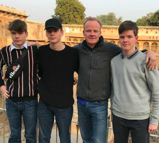 Os gêmeos, que participam como estudantes de Moordale, são Cal e Brodie Petrie. O ator de Sex Education ainda tem um filho mais velho, Angus. Todos são frutos do casamento com a atriz Lucy Scott.