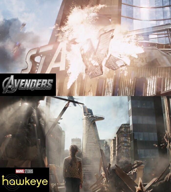 No começo de Gavião Arqueiro, quando a jovem Kate Bishop olha para fora de sua casa destruída, vemos a Torre Stark, que está faltando algumas letras. À primeira vista, parece uma homenagem bacana para Os Vingadores.