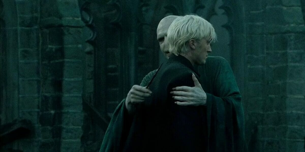 Uma das cenas mais desconfortáveis de todo Harry Potter é quando Voldemort abraça Malfoy. Depois de chamá-lo para os Comensais da Morte no meio da Batalha de Hogwarts, o Lorde das Trevas desajeitadamente coloca seus braços ao redor de um de seus seguidores mais aterrorizados.