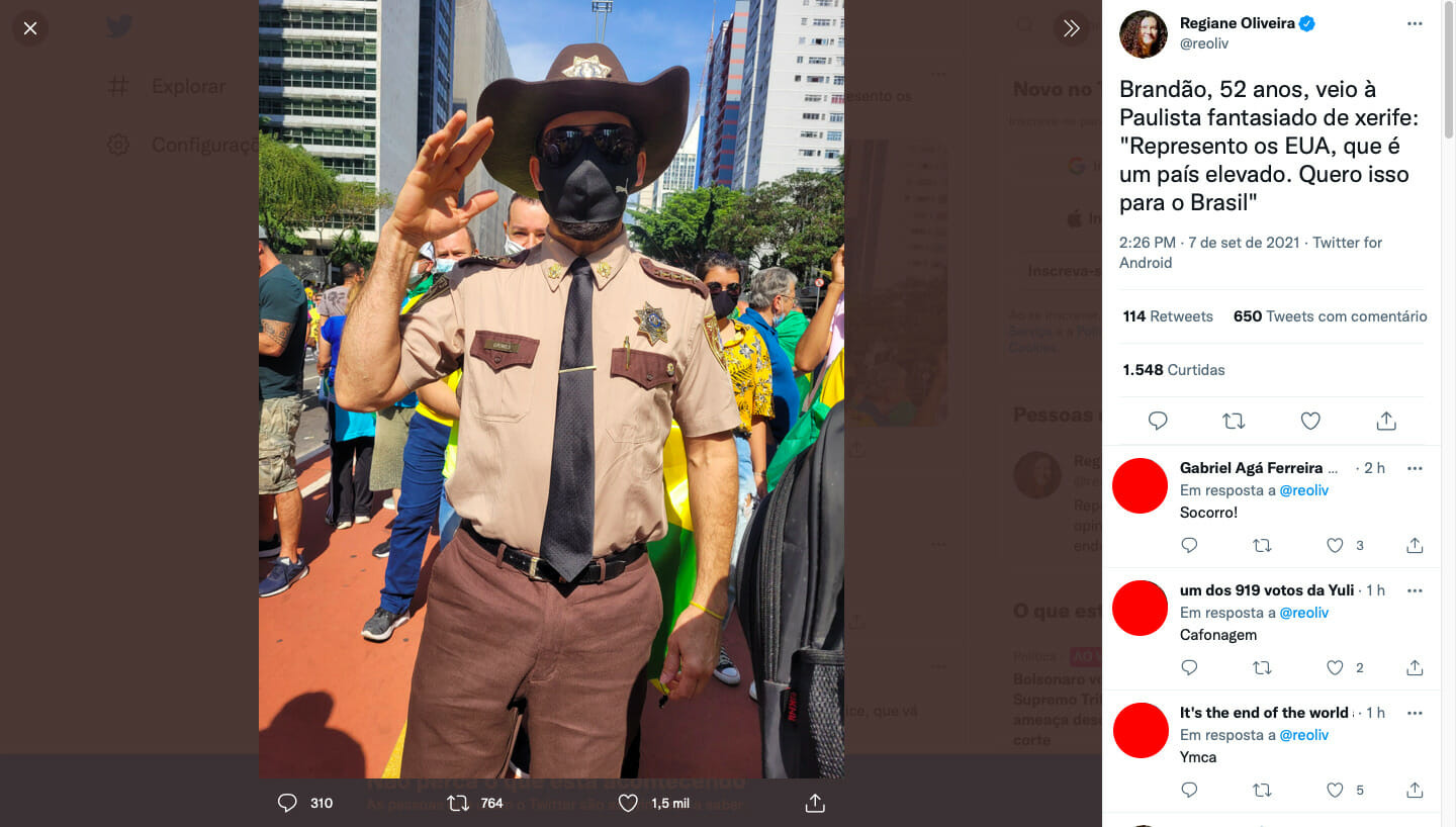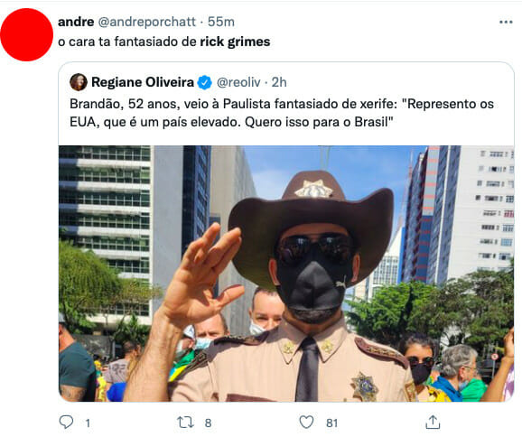 O destaque foi feito pela jornalista Regiane Oliveira, do El País. A comunicadora destacou a fala do manifestante, mas o detalhou roubou a cena para outros internautas.