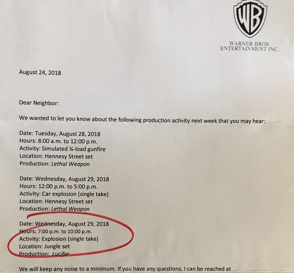 O usuário “tc215487” no Reddit compartilhou um aviso que recebeu da Warner Bros. Entertainment em que a empresa anuncia que fará algumas filmagens ao redor de sua vizinhança, que podem incluir sons altos. Na agenda recebida pelo rapaz, há o aviso de uma locação na floresta (veja abaixo).