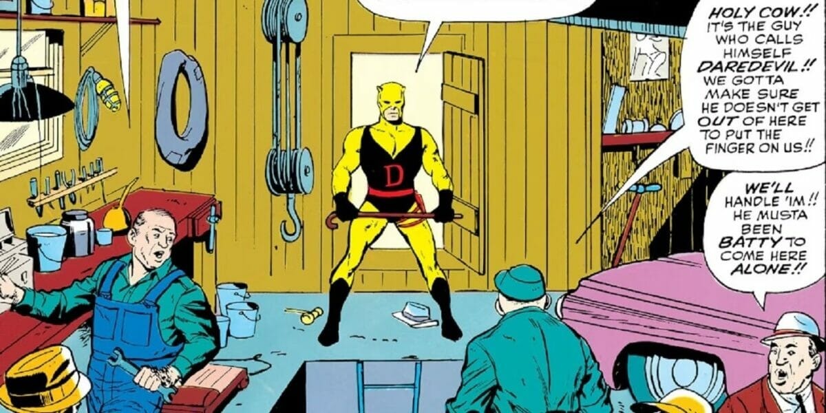 Além disso, o jovem Matt Murdock fez isso com “camisas velhas” tiradas de um baú. As primeiras edições de Demolidor passaram por muitas equipes criativas, às vezes por mês, até que o traje vermelho clássico estreou na edição #7, em novembro daquele ano.