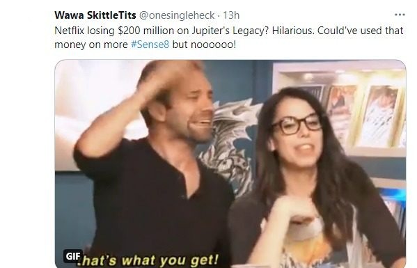 “Netflix perdeu US$ 200 milhões em O Legado de Júpiter? Hilário. Poderia ter usado esse dinheiro em mais Sense8, mas nãããão”, tuitou uma fã.