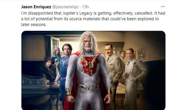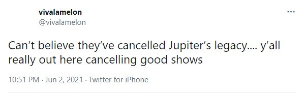 “Não acredito que cancelaram O Legado de Júpiter… vocês realmente estão cancelando séries boas”, tuitou um fã.