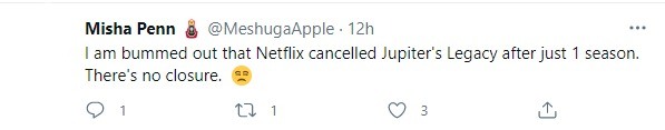 “Estou triste que a Netflix cancelou O Legado de Júpiter depois de uma temporada apenas. Não há desfecho”, tuitou outra fã.