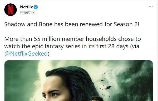 “Sombra e Ossos foi renovada para a 2ª temporada! Mais de 55 milhões de famílias escolheram assistir a série de fantasia épica em seus primeiros 28 dias”, diz o tuite da Netflix.