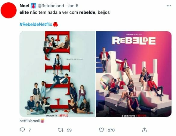 Assim, pelo cenário, por envolver estudantes em dramas e até um mistério, Rebelde e Elite são comparadas. Mas, nas redes sociais, uma outra situação foi vista.