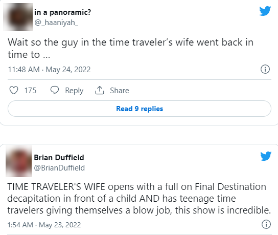 “A Mulher do Viajante no Tempo começa com uma decapitação ao estilo de Premonição na frente de uma criança E tem adolescentes viajando no tempo para fazerem sexo oral consigo mesmo, esse show é incrível”, disse outro fã.