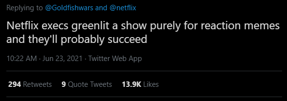 “Os executivos da Netflix deram sinal verde para uma série simplesmente para criar memes de reação, e provavelmente serão bem sucedidos”, comentou um usuário do Twitter.