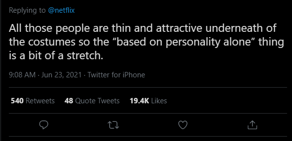 “Todas essas pessoas são magras e atraentes, mesmo debaixo das fantasias. Então esse papo de ‘só baseado na personalidade’ é no mínimo um exagero”, concordou outro assinante da Netflix.