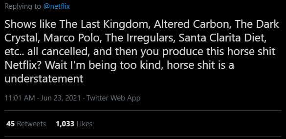 “Séries como The Last Kingdom, Altered Carbon, O Cristal Encantado, Marco Polo, Os Irregulares de Baker Street, Santa Clarita Diet… todas canceladas. E agora vocês produzem essa porcaria, Netflix? Na verdade, estou sendo muito gentil, é bem pior do que uma porcaria”, detona outro internauta.