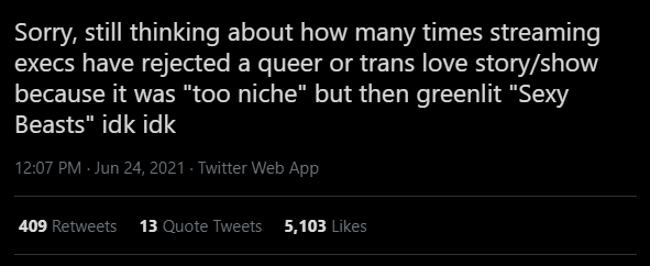 “Ainda estou pensando na quantidade de vezes que os executivos do streaming rejeitaram uma história de amor trans ou queer pois eram ‘muito específicas’, e agora dão o sinal verde para Sexy Beasts”, comentou um jornalista.