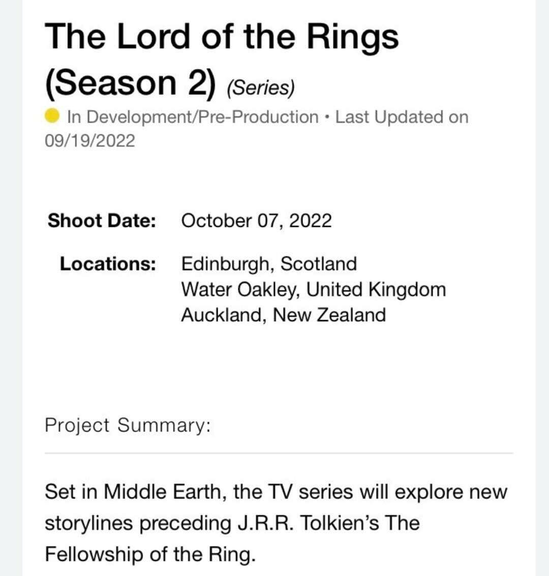 Um novo relatório divulgado pela página Fellowship of Fans no Twitter, revelou que as filmagens do segundo ano serão iniciadas em 7 de outubro (We Got This Covered).