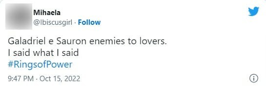 “Galadriel e Sauron, de inimigos a amantes. Eu disse o que eu disse”, tuitou mais uma fã.