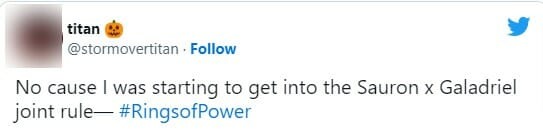 “Só porque eu estava começando a gostar da ideia do governo conjunto de Sauron e Galadriel”, disse outro fã.