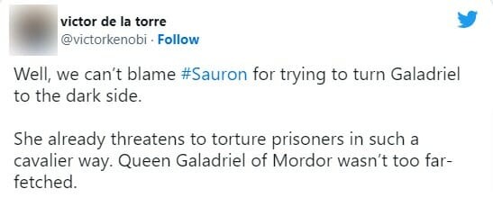 “Bem, não dá pra culpar o Sauron por tentar levar Galadriel ao lado sombrio. Ela já ameaça torturar prisioneiros. Rainha Galadriel de Mordor não é tão absurdo assim”, disse mais um fã.