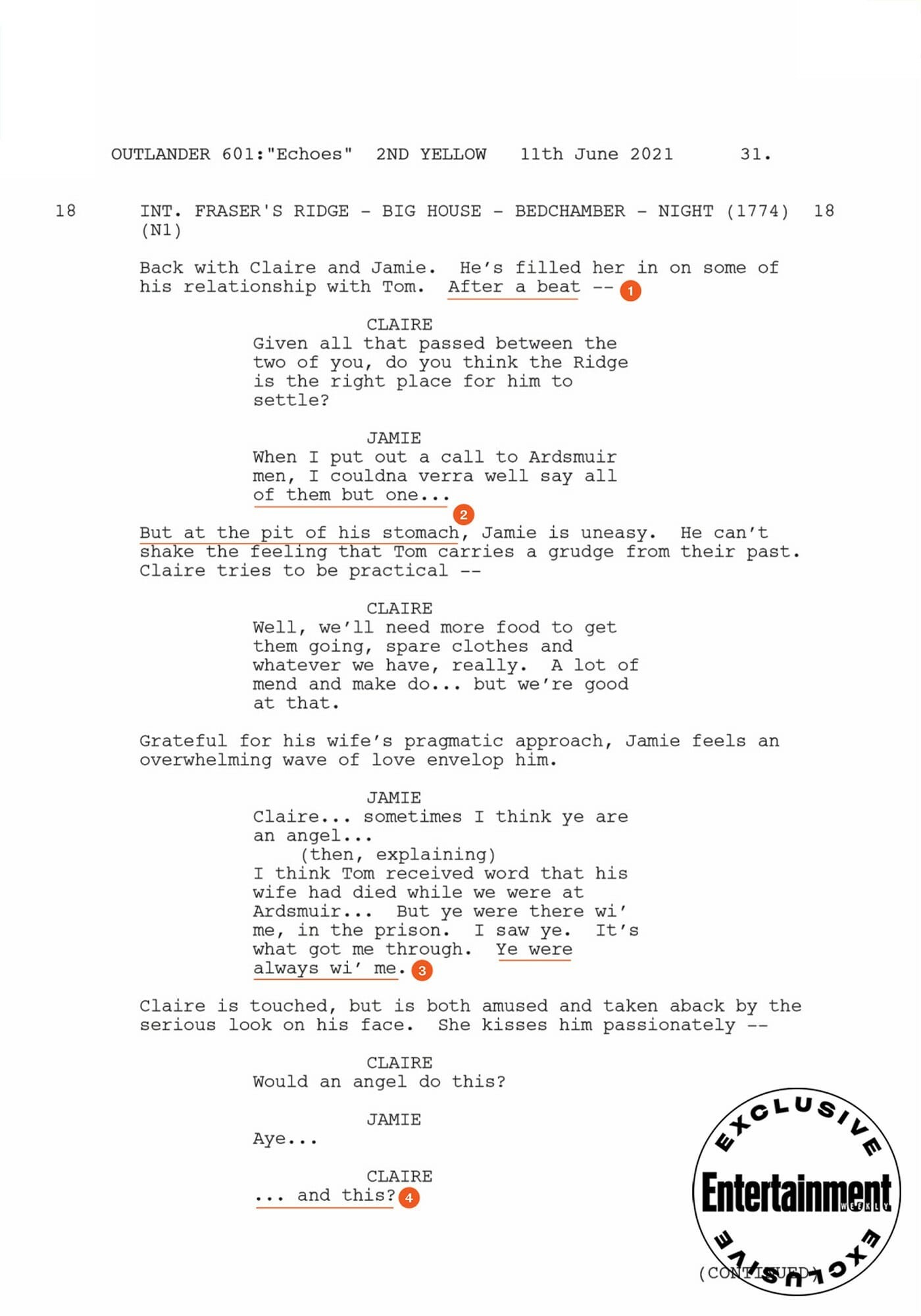 Depois da conversa, Jamie e Claire começam a se beijar, o que leva a momentos mais quentes. Veja a página do roteiro, abaixo.
