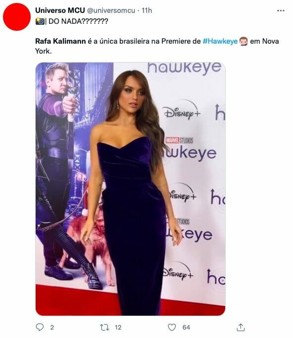 Contratada da Globo, a ex-Big Brother Brasil e apresentadora Rafa Kalimann chamou atenção ao aparecer na pré-estreia de Nova York de Gavião Arqueiro, nova série da Marvel no Disney+. A influenciadora foi a única brasileira no evento realizado na cidade.