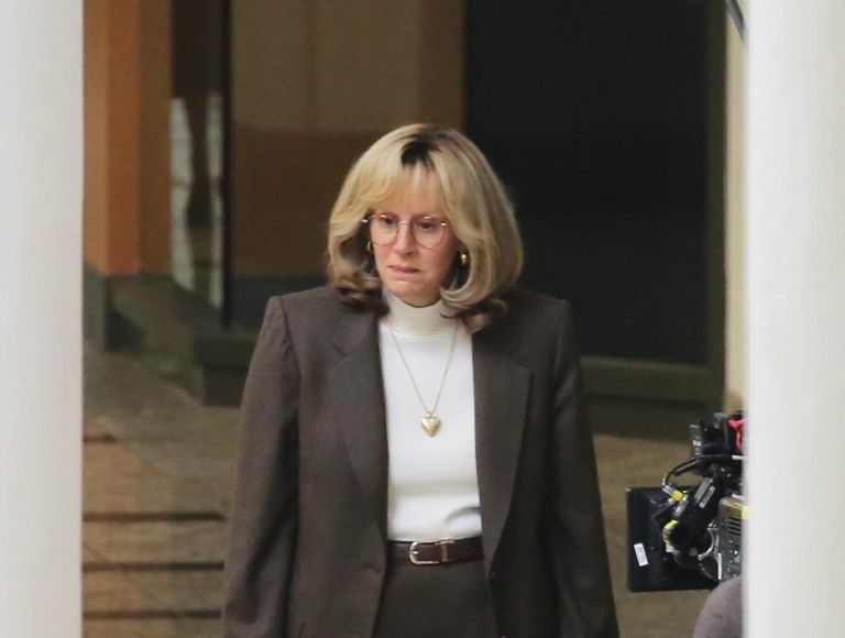 Sarah Paulson usa óculos, um cabelo curto loiro e ainda preenchimento para ter uma estrutura física diferente. O figurino é dos anos 1990, quando a história se passa.