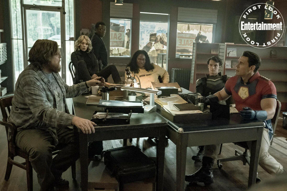 A imagem apresenta o Pacificador, interpretado por John Cena, junto com a equipe com a qual ele terá que salvar o mundo. Sentado ao seu lado, aliás, está o Vigilante, personagem dos quadrinhos da DC que será vivido por Freddie Stroma.