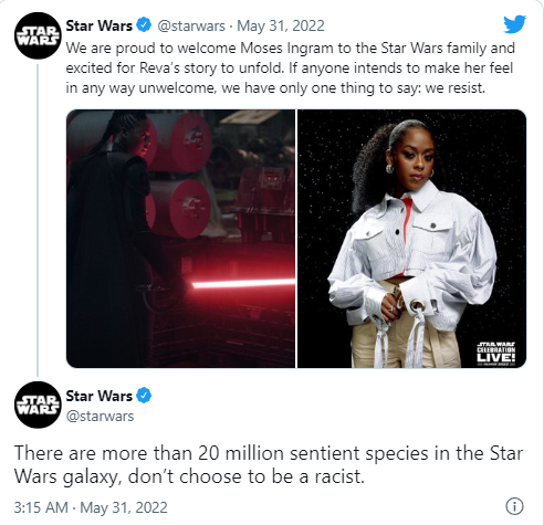 “Estamos orgulhosos em dar boas-vindas a Moses Ingram à família Star Wars e empolgados para ver a história de Reva se desenrolar. Caso alguém faça ela se sentir indesejada, temos apenas uma coisa a dizer: nós resistimos”, diz um tuite de Star Wars.