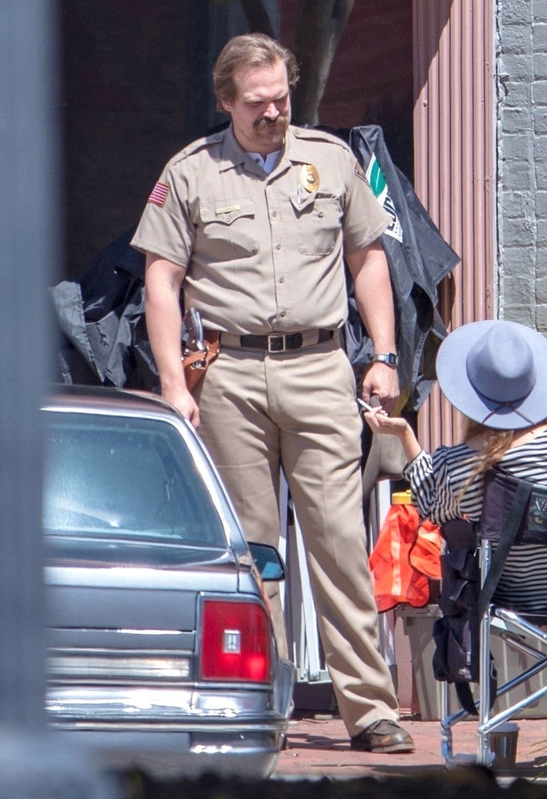 A 3ª temporada de Stranger Things está filmando na cidade de Canton (EUA), e o DigitalSpy tem uma foto do set que mostra a mudança de visual para Hopper (David Harbour).