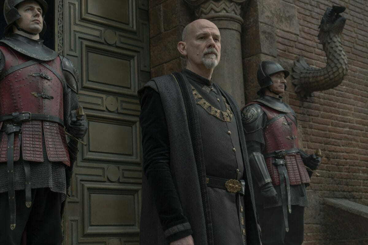 A chegada fria de convidados tão importantes já começa a demonstrar o quanto a corte dominada pela família Hightower está diferente. Mas mesmo assim, temos a presença de Caswell, que tinha aparecido no 6º episódio da temporada, quando oferece seus serviços após Rhaenyra acabar de dar a luz, ao que a princesa responde: “O dia vai chegar milorde”.
