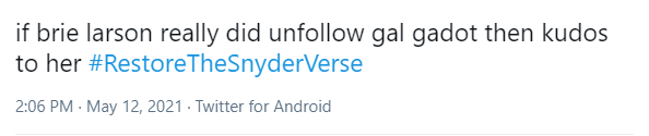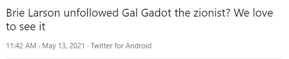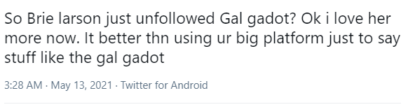 “Então a Brie Larson deixou de seguir a Gal Gadot? Ok, agora eu gosto ainda mais dela. É melhor do que usar sua grande plataforma para dizer coisas como as que Gal Gadot disse”, afirmou um fã no Twitter.