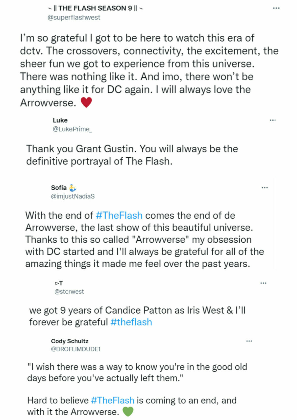 “Com o fim de The Flash chega o fim do Arrowverse, a última série desse lindo universo. Graças a este chamado “Arrowverse”, minha obsessão pela DC começou e sempre serei grata por todas as coisas incríveis que me fez sentir nos últimos anos”, disse uma fã.