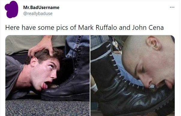 “Aqui algumas fotos de Mark Ruffalo e John Cena”, tuitou um fã, com imagens de duas pessoas lambendo coturnos do exército.