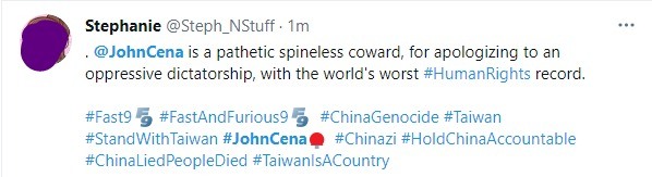 “John Cena é um covarde patético por pedir desculpas para uma ditadura opressora com o pior recorde de direitos humanos”.