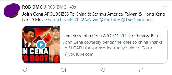 “John Cena PEDE DESCULPAS à China e trai os EUA, Taiwan e Hong Kong por causa de Velozes e Furiosos 9”, tuitou um fã sobre o caso de John Cena.