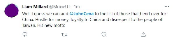 “Bem, acho que podemos acrescentar John Cena à lista das pessoas que se curvam à China. Se vende por dinheiro, declara lealdade à China e desrespeita o povo do Taiwan”, escreveu outro fã.