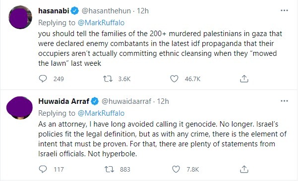 “Você deveria falar para as famílias dos mais de 200 palestinos assassinados em Gaza, que foram declarados inimigos combatentes nas recentes propagandas israelenses, que os invasores não estão realizando limpeza étnica”, escreveu um fã.