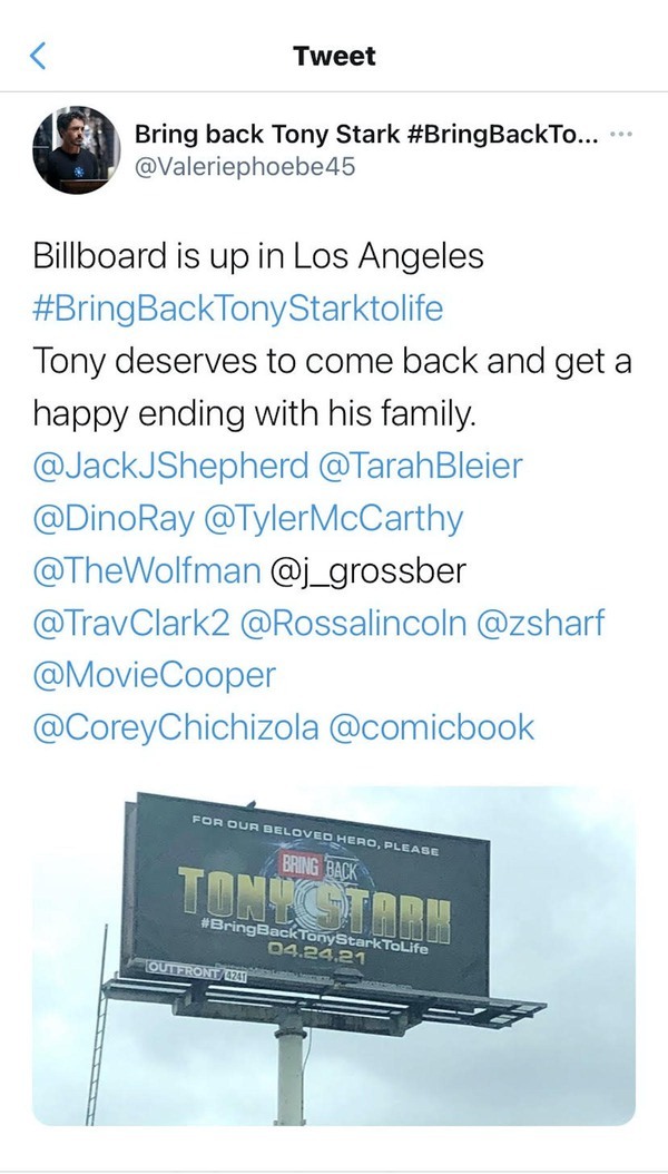 Mesmo com a morte do personagem, os fãs querem o retorno do Homem de Ferro. Esse grupo de espectadores do MCU até alugou um outdoor pedindo a volta.