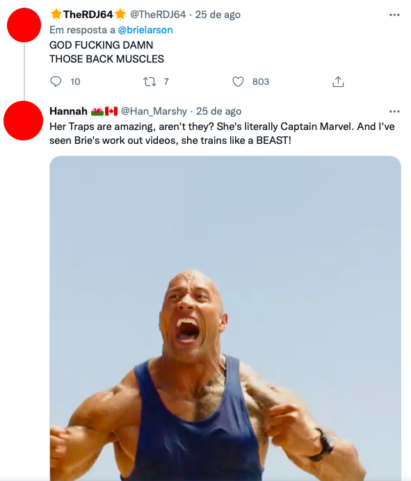 “São incríveis, não são? Ela literalmente é a Capitã Marvel. E eu vi os vídeos dela treinando, ela treina como uma fera”, respondeu um segundo.