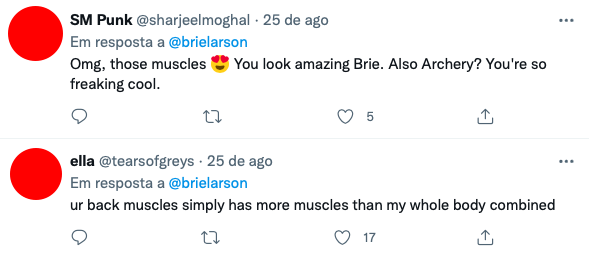 No Twitter, a famosa também mostrou a imagem dela se preparando para um tiro. Foi com essa postagem que os fãs notaram o detalhe. Muitos passaram a comentar sobre os músculos das costas de Brie Larson.