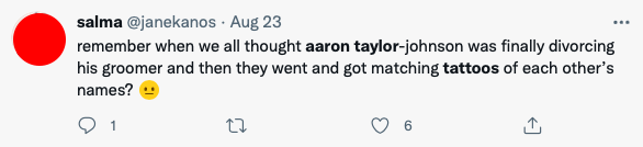 “Lembram quando achávamos que Aaron Taylor-Johnson enfim estava se separando da predadora dele e eles fizeram tatuagens juntos?”, postou uma.
