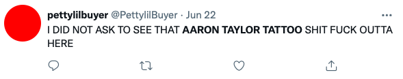 “Eu não pedi para ver a tatuagem de Aaron Taylor. Droga, saia daqui”, publicou outra.