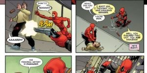 ELE ATACOU UM HOMEM INOCENTE PARA ESCAPAR | Deadpool e Demolidor se desentenderam uma vez, e o Demônio de Hell’s Kitchen quis ir atrás do Mercenário. Um bando de civis reunia-se para assistir ao espetáculo, e um deles era o ingresso de Deadpool para a liberdade; Deadpool usa sua arma para atirar em um homem na perna. Embora a ferida não seja instantaneamente fatal, ele atingiu uma artéria importante. Isso força o Demolidor a fazer uma escolha: levar o homem para o hospital e deixar Deadpool fugir, ou continuar lutando com Deadpool e deixar o homem sangrar. Sendo um herói, Murdock escolhe o primeiro e Wilson é capaz de escapar.