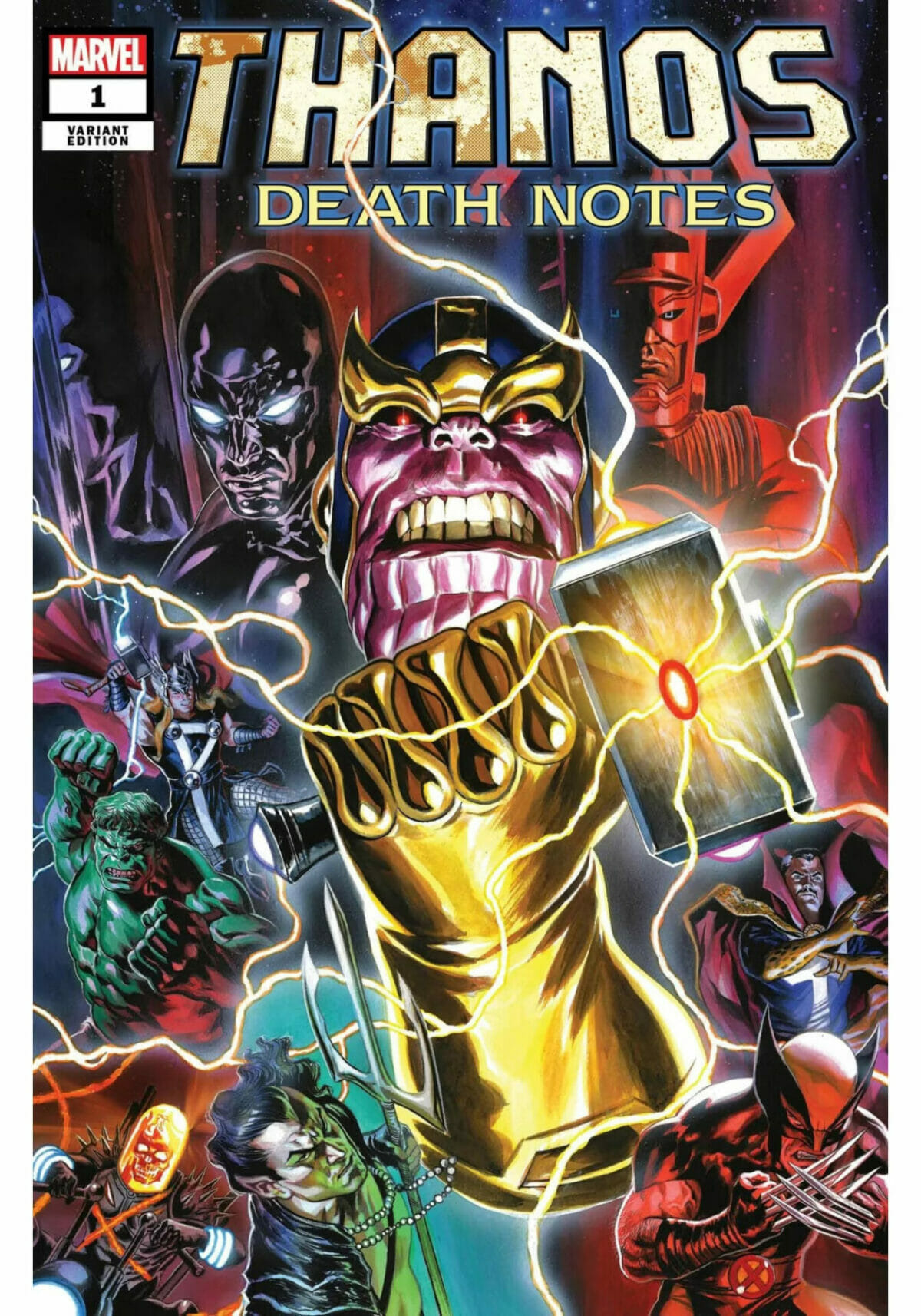 Na arte da capa variante, Thanos empunha a Manopla do Infinito enquanto segura a versão superpoderosa de Mjolnir, enquanto Galactus, Doutor Estranho, Hulk, Wolverine e o Surfista Prateado só pode assistir com horror enquanto ele mostra sua incrível arma.