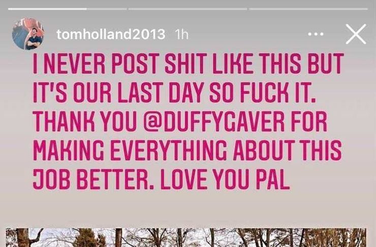 Ao que parece, a mesma forma foi mantida para Homem-Aranha 3. Na imagem publicada para No Way Home, Tom Holland agradeceu ao treinador Duffy Gaver.