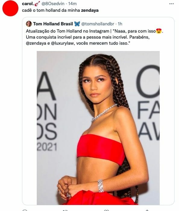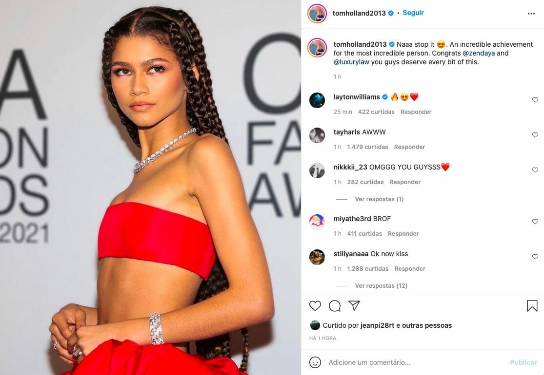 Tom Holland, astro de Homem-Aranha na Marvel, voltou a publicar foto de Zendaya no Instagram. Dessa vez, o ator enalteceu a conquista da “incrível” pessoa como ícone da moda no CFDA Awards de 2021.