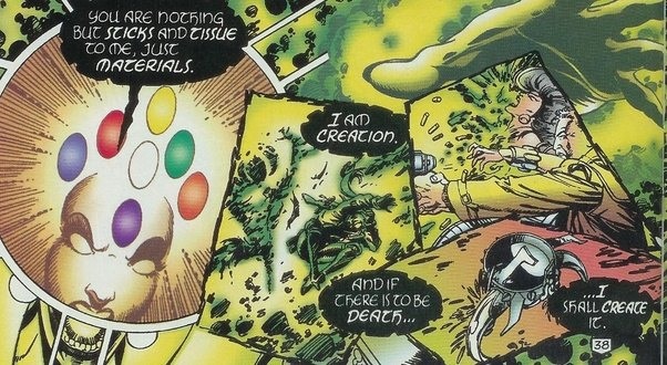 Algumas pessoas acreditam que o único que pode derrotar Thanos é o próprio Thanos. Mas como isso aconteceria? Bem, Thanos ficou poderoso como um deus em Guerra Infinita. Isto fez com que ele tomasse conhecimento de que ninguém poderia ter o poder de um deus. Com tal pensamento em mente, ele mesmo se destruiria e destruiria consigo a Manopla do Infinito como forma de evitar que outras pessoas obtivessem o poder que ele teve.